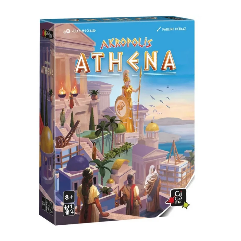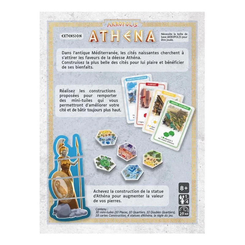 Akropolis – Extension Athena. Dans la Méditerranée antique, les jeunes cités rivalisent d’ingéniosité architecturale pour surpasser leurs voisines en prestige. Toutes aspirent à obtenir les faveurs d’Athéna, déesse de la sagesse, de la guerre et des artisans, afin de bénéficier des richesses et des honneurs qu’elle peut offrir. En tant qu’Architecte, c’est à vous de jouer ! Votre talent et vos choix façonneront la gloire et la renommée de votre cité à travers les âges.