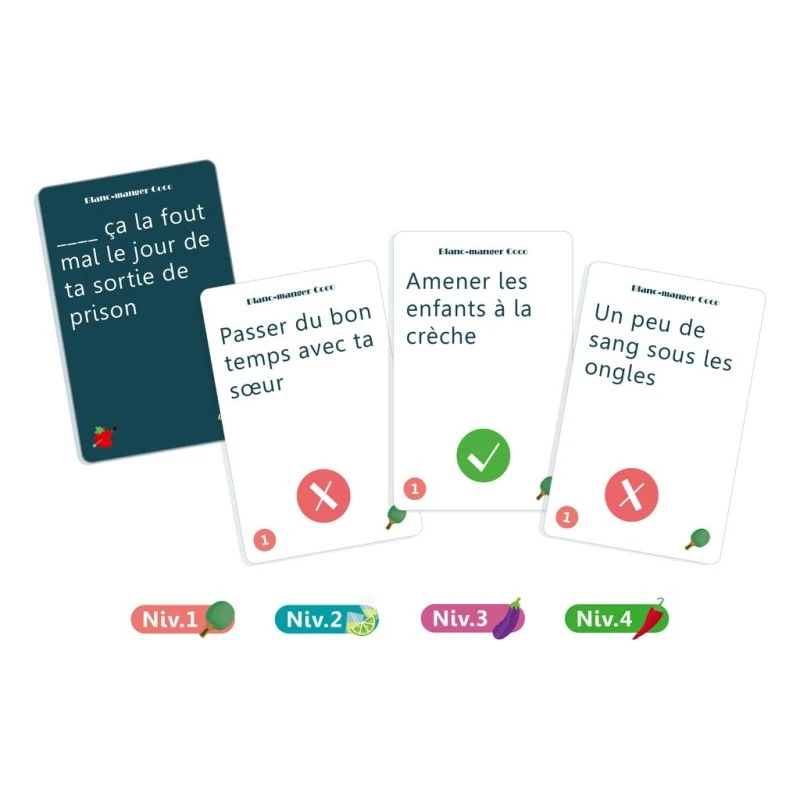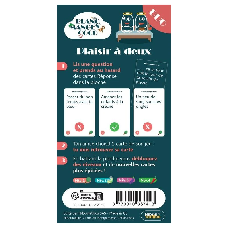 Blanc Manger Coco : Plaisir à Deux. Préparez-vous à relever un défi épicé à deux ! Dans cette version « Duo » de Blanc Manger Coco, vous allez tester votre complicité tout en essayant de battre la pioche sur 10 manches. Chaque victoire vous propulse vers un niveau supérieur, avec des cartes de plus en plus osées et des questions plus corsées. À chaque étape, l’ambiance monte d’un cran, et de nouvelles cartes « pimentées » viennent pimenter le jeu. Un seul objectif : avoir la meilleure réplique et passer au niveau suivant ! Mais attention, plus vous progressez, plus les cartes deviennent audacieuses… Oserez-vous franchir la ligne ?