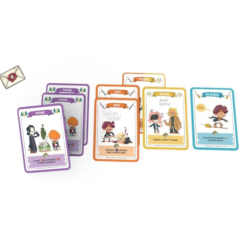 Bloody Harry, le jeu de carte familial fun ambiance bandes dessinées sur petit fond d’Harry Potter, héhé ! Dans ce jeu de société, vous incarnez une maison parmis les 4 disponibles. Chaque maison possède un pouvoir différent. Vous devrez collectionnez les cartes écoles afin de bénéficier d’effets supplémentaires et obtenir des points de victoire. Jouez des cartes sortilèges pour prendre l’avantage face à vos adversaires et obtenez des points et des actions supplémentaires avec les courriers et les cartes bonus !