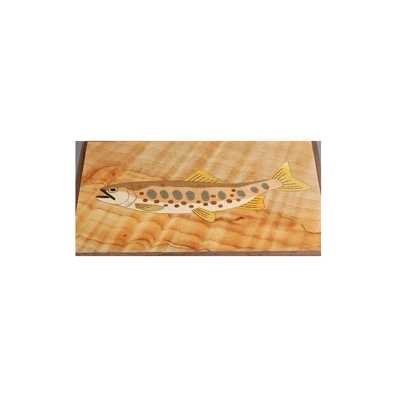 Boîte à secret japonaise 4 sun 10 mouvements Fish. Casse-tête décoratif traditionnel japonais himitsu bako en marqueterie de bois et contour en noyer. Motif : poisson japonais.