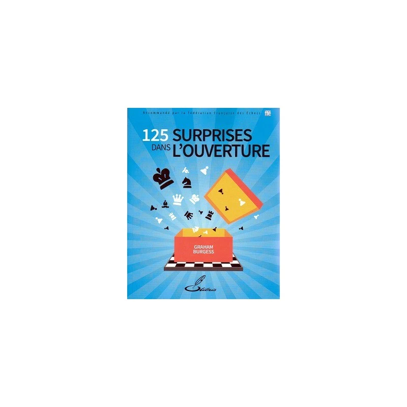 Burgess – 125 Surprises dans l’Ouverture. Livre en français sur les ouvertures au jeu d’échecs. Vous n’êtes pas satisfait de votre répertoire d’ouvertures et disposez de peu de temps avant votre prochaine partie ? Ou vous jouez régulièrement les mêmes lignes et vous vous méfiez de la préparation de votre adversaire ? Ou, tout simplement, vous aimez expérimenter des idées originales ? Quelles que soient vos raisons, dans tous les cas où il est bon de disposer d’une arme-surprise, ce livre vous sera très utile.