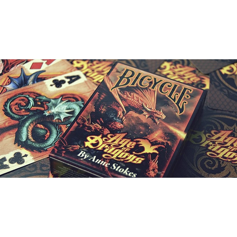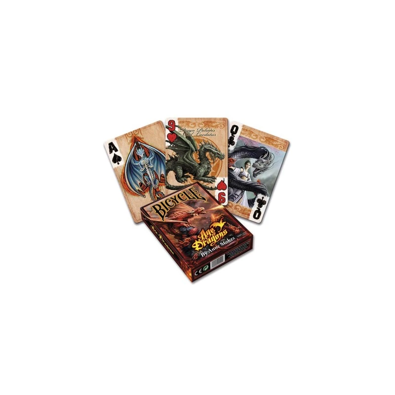 Cartes à jouer Bicycle Age of Dragons par Anne Stokes. 54 cartes de collection avec une finition sur coussin d’air (Air-Cushion) sur les différentes espèces de dragons.