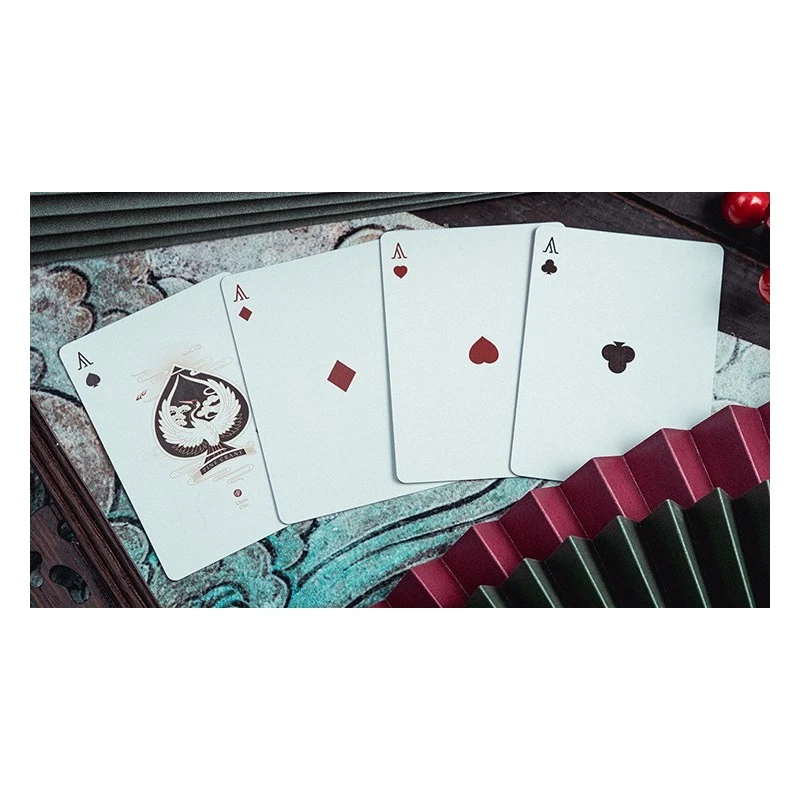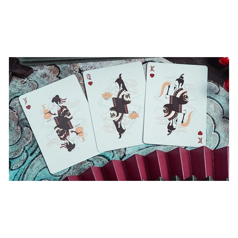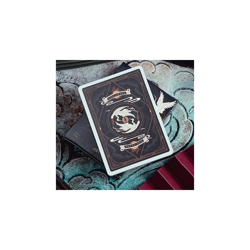 Un jeu dont les illustrations gravitent autour de la symbolique de la Grue et du Pin, oiseaux et arbres si présents dans la culture chinoise et japonaise. Un jeu poétique, élégant et plein de charme pour vous accompagner dans toutes vos parties de cartes, tours de magie, ou simplement pour votre collection et le plaisir de yeux !