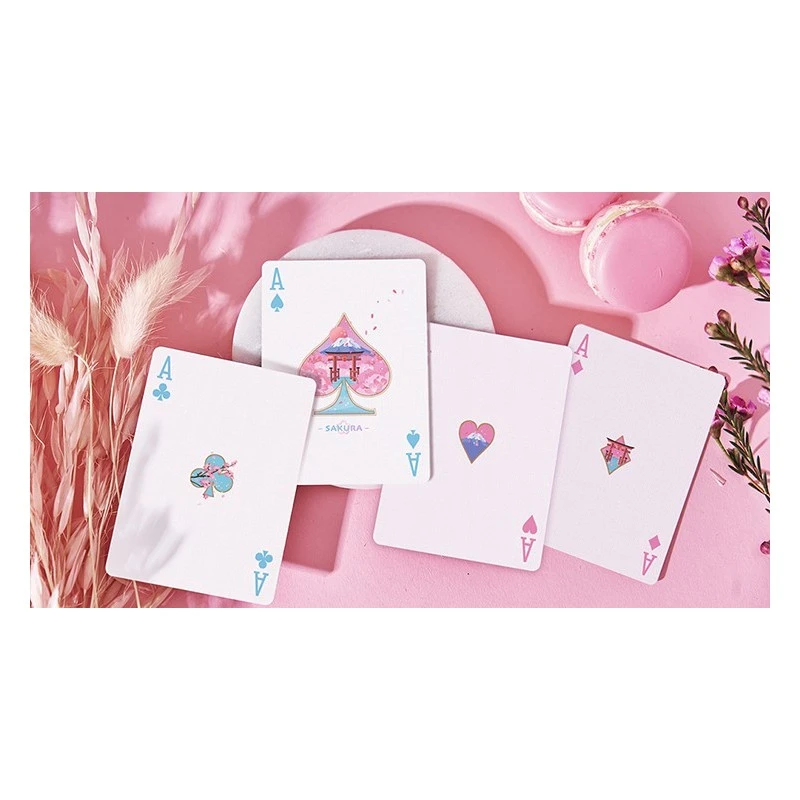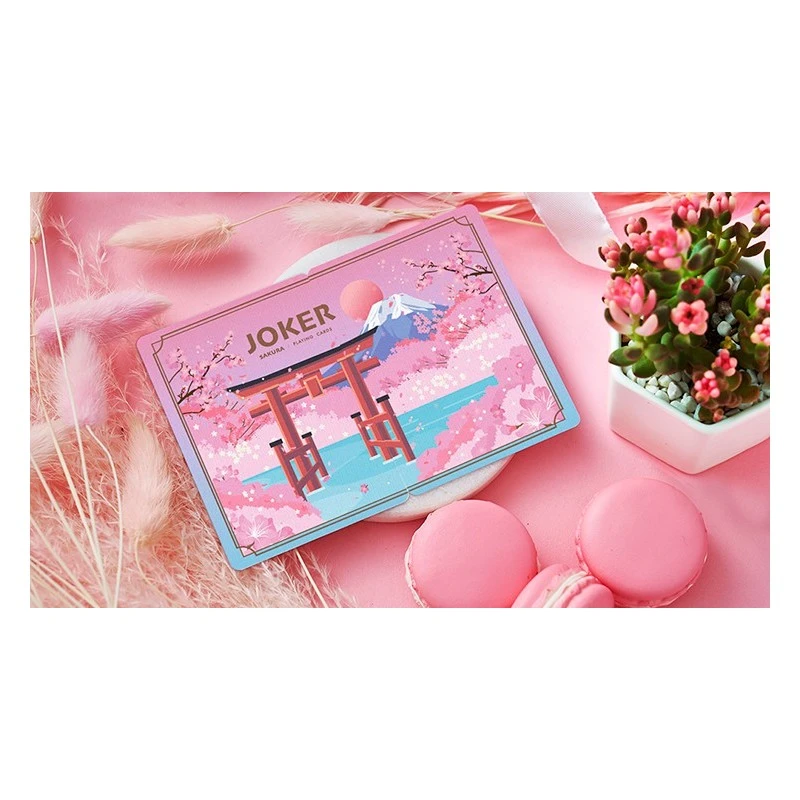 Magnifiques cartes à jouer Bicycle Solokid Sakura ! 54 cartes délicatement et traditionnellement illustrées : cerisiers en fleur, Mont Fuji, soleil et lune, portes rouges (les fameux tori), tout y est pour vous faire voyager au Japon. Les Joker mis côte à côte forment un paysage poétique aux couleurs roses.