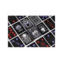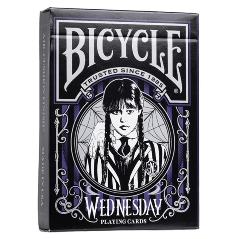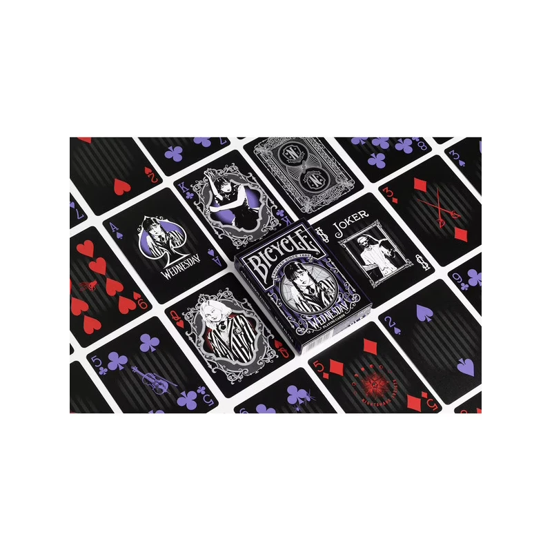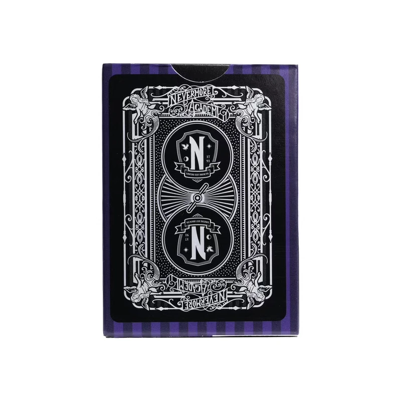 Plongez dans le monde sombre de la Nevermore Academy avec les cartes à jouer Bicycle Wednesday ! Inspirées par la célèbre série Netflix mettant en scène Jenna Ortega dans le rôle de Mercredi Addams, votre prochaine partie de cartes vous entraînera dans une danse macabre palpitante, tandis que vous mélangez des cartes noires ornées de personnages favoris de la série. Des illustrations exquises de personnages comme Mercredi Addams, Enid Sinclair, Marilyn Thornhill et bien d’autres hantent les cartes de cour. Des créatures effrayantes comme des araignées, des piranhas, des corbeaux, ainsi que des références à la série décorent le jeu.