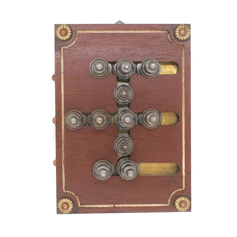 Magnifique casse-tête en bois avec de petites pièces d’échecs en métal faisant parti de la mécanique d’ouverture. Une bien mystérieuse boite…