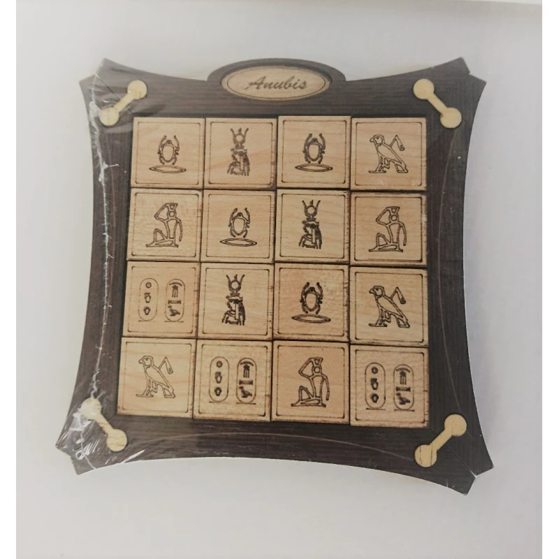 Casse-tête Isis. Casse-tête en bois de niveau difficile. Objectif: retirer les 16 pièces carrées du cadre et les repositionner dans le cadre en respectant certaines contraintes de positionnement. Dans le fond du cadre, une fois que vous aurez retiré les pièces, vous verrez 16 symboles dessinés.