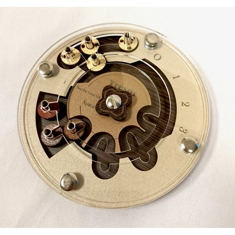 Casse-tête de niveau moyen à difficile (force 5 sur 7). Pour réussir ce casse-tête vous devrez placer les petites pastilles en bois dans les bons emplacements grâce au système de rotation du disque.