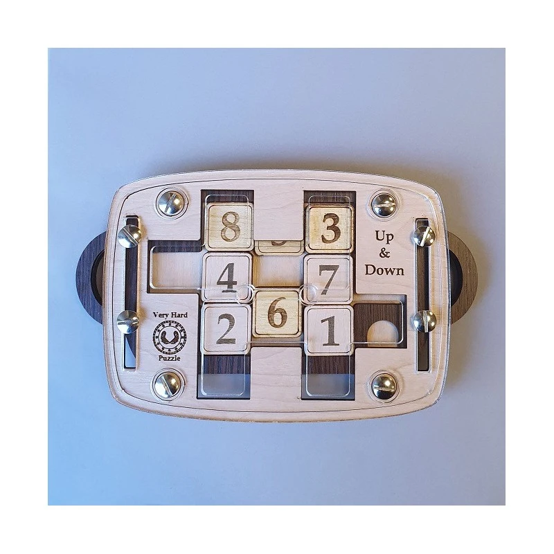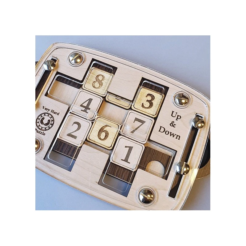 Casse-tête de collection en bois Up and Down type taquin. Fabriqué en Europe. Difficulté élevée. Trouver les différentes combinaisons possibles pour arriver au même résultat.