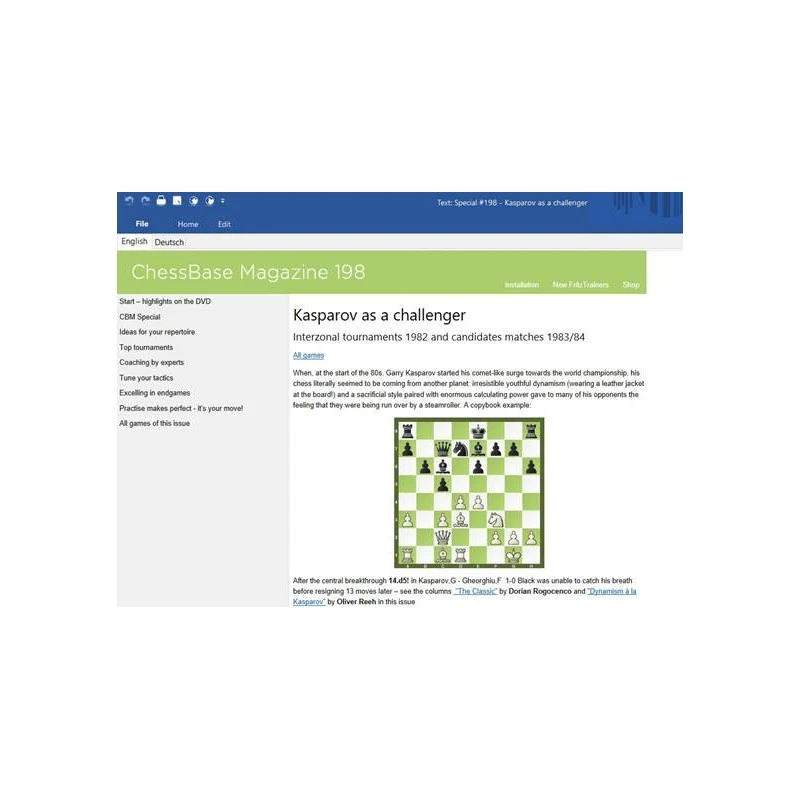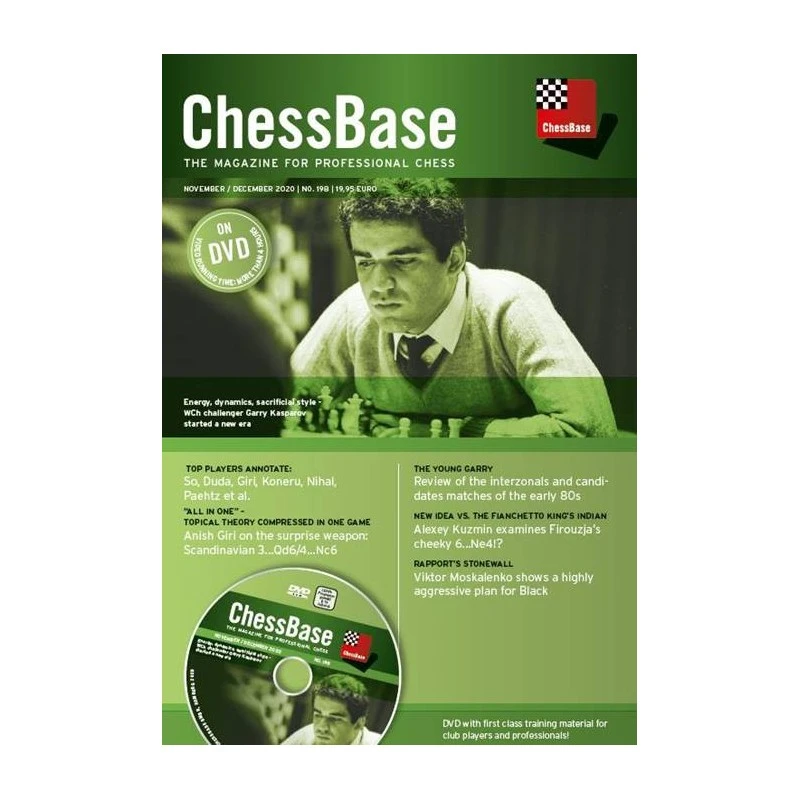 ChessBase Magazine 198 (Novembre-Décembre 2020). ChessBase Magazine is the most comprehensive and most sophisticated chess magazine there is. World class players analyze their brilliancies and explain the ideas behind the moves to you, opening specialists present the latest trends in opening theory and offer exciting ideas for your repertoire. Master trainers in the fields of tactics, strategy, and the endgame show you the tricks and techniques a successful tournament player needs! DVD with several hours of video + booklet.