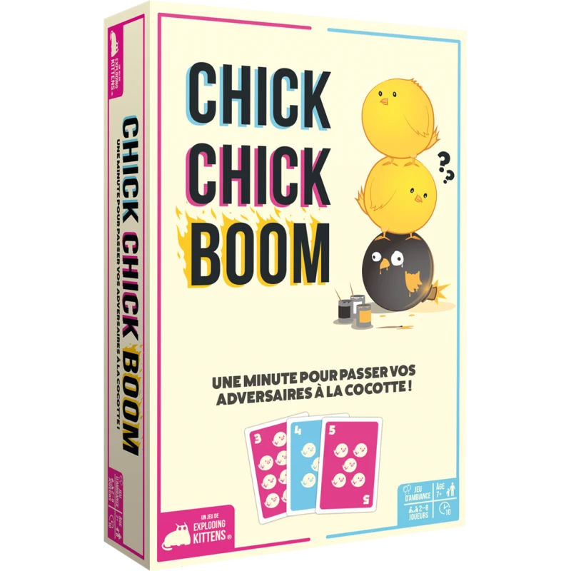 Chick Chick Boom est un jeu de cartes pour 2 équipes. À la fin de chaque manche, votre objectif est d’avoir plus de Poussins visibles que l’équipe adverse. Une manche ne dure que 60 secondes. Chaque équipe a 3 piles devant elle et une pioche de cartes à sa couleur (bleu ou rose). Ces cartes portent toutes un nombre de 1 à 8 et un certain nombre de poussins (sans lien direct avec le chiffre).