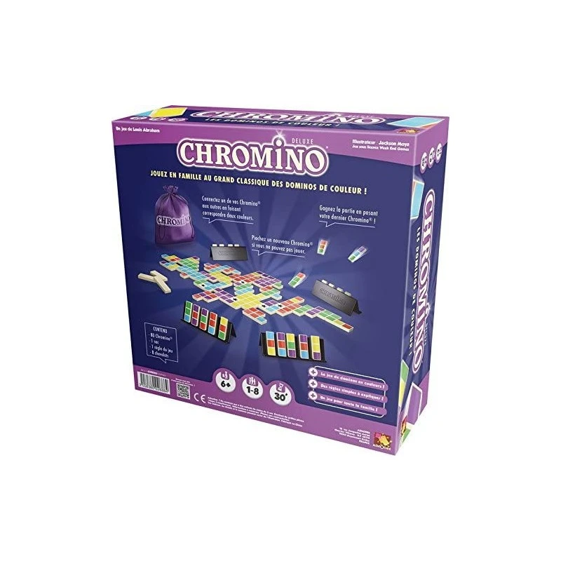 Chromino Deluxe est un jeu tactique familial. C’est une alternative parfaite aux traditionnels dominos. Vous devrez placez vos pièces de couleur en les connectant aux tuiles Chromino déjà posées. Chaque chromino fait 3 carrés de long, chacun de ces carrés pouvant être d’une couleur différente. Une pièce posée doit être posée à côté d’une autre pièce au moins, de façon à ce que la pièce possède deux couleurs connectées avec ses voisines.