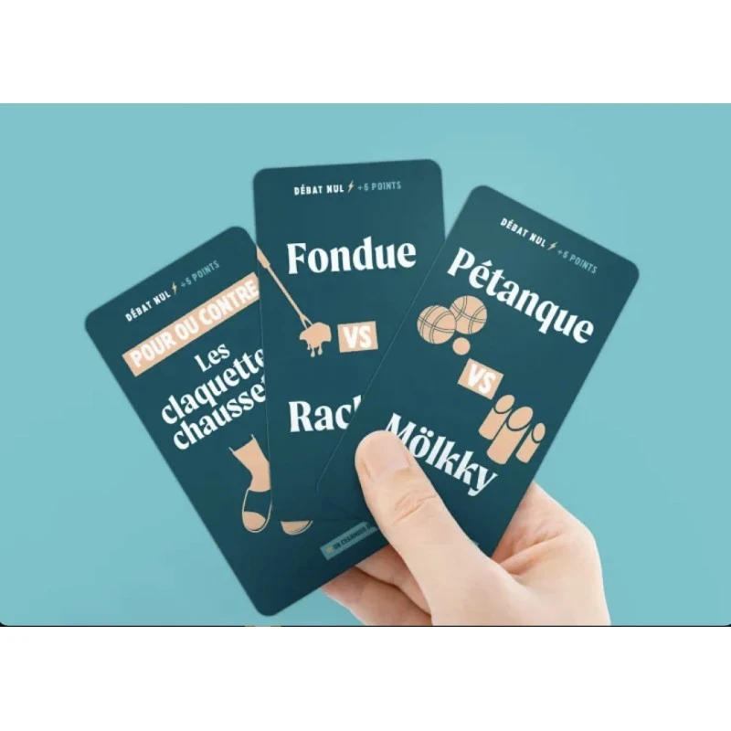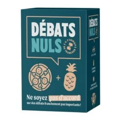 Débats Nuls est un jeu d’expression et d’improvisation dans lequel vous devrez débattre sur des sujets qui n’ont aucun intérêt ! Et c’est justement ça qui est intéréssant ! La pizza à l’ananas est-elle une aberration ? Ouvrez le débat dans ce jeu de cartes d’apéro qui donnera lieu à des discussions absurdes. Humour et rires garantis en fonction des joueurs !