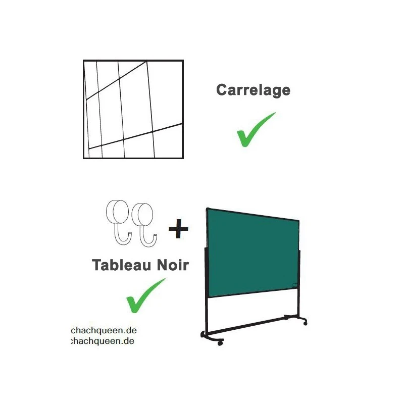 Grâce à son système auto-adhésif, l’échiquier adhère à toutes les surfaces lisses comme le tableau blanc interactif souvent utilisés par les écoles ou les entreprises mais également les armoires, les portes, le verre et autres.