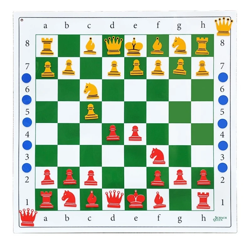 Excellent contraste : échiquier vert et blanc, pièces d‘échecs rouges et jaunes, points didactiques bleus (10 pièces) et une dame extra par couleur.