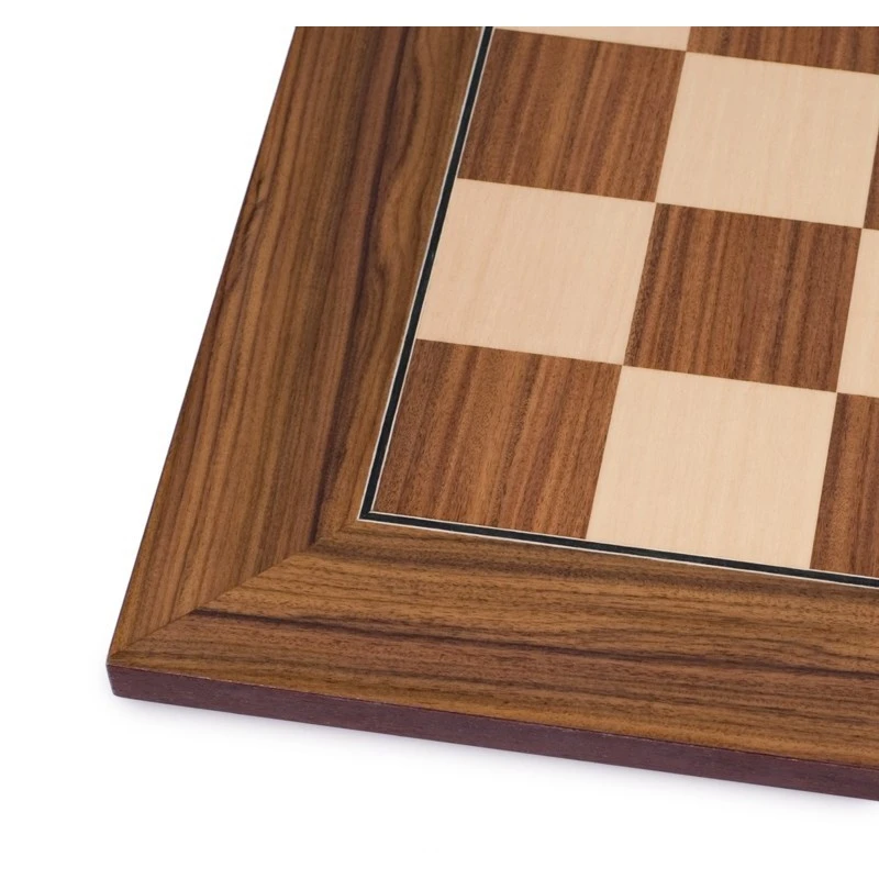 Echiquier Palissandre Santos Taille 5. Cet échiquier en marqueterie de bois de palissandre et sycomore dont les cases mesurent 50 mm de côté est idéal pour mettre en valeur les pièces d’échecs en palissandre ou en ébène.