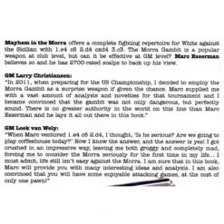 Couverture volontairement tapageuse et provocatrice pour ce nouvel opus sur le Morra… C’est bien sûr du second degré (la Sicilienne réfutée ? Ben voyons…) – sauf que le seul à prendre ça au sérieux est, apparemment, l’auteur. Au lieu de présenter le Morra pour ce qu’il est (une arme surprise intéressante mais douteuse en usage systématique), il essaye de nous convaincre qu’il vient de réinventer l’aspirateur sans sac. A vous de voir…