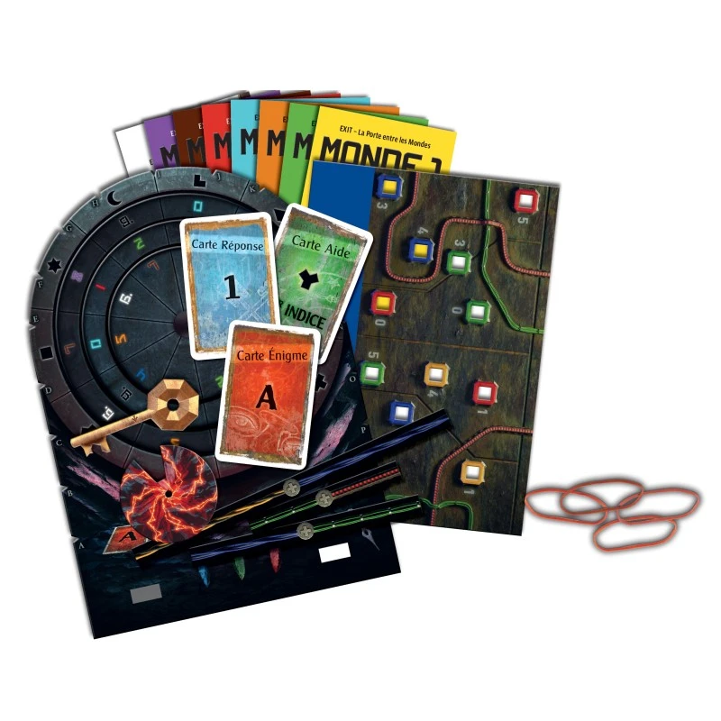 Exit, La Porte entre les Mondes, le nouvel opus de la série d’escape game à succès. Cette carte antique vous a mené jusqu’ici, devant cet incroyable portail mystique. Mais… regardez ! Les anneaux qui la décorent semblent vibrer ! Parviendrez-vous à les actionner pour activer ce portail ? Et plus important encore : où risquez-vous d’être transporté ? EXIT est un jeu qui reprend les sensations des « escape games ». Muni d’indices, de matériel et d’un décodeur, vous aurez pour mission de sortir du jeu le plus rapidement possible. Plus qu’un jeu, EXIT est une expérience unique et immersive dans laquelle vous devrez faire preuve de coopération, d’observation et de logique.