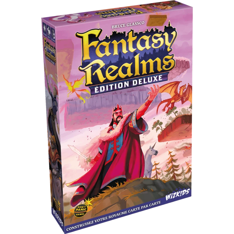 Fantasy Realms Edition Deluxe. Construisez votre royaume carte par carte en rassemblant des bêtes, des armées, des sorciers et bien plus encore ! Chaque carte est unique et rapporte des points en fonction des autres cartes de votre main. Vous commencez avec sept cartes et à chaque tour, vous tirez une nouvelle carte de la pioche ou de la défausse, puis vous vous débarrassez d’une carte de votre main en essayant toujours d’améliorer votre royaume ! Celui dont le royaume marque le plus de points à la fin de la partie est le vainqueur !
