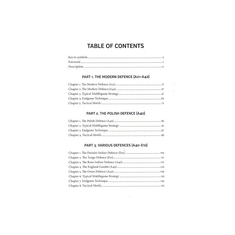 Then we move on to examine various side-lines, which are included in the ‘Various Defences’ chapter. These openings are the ‘Dzindzi-Indian Defence’, the ‘Tango Defence’, the Bozo-Indian Defence’, the ‘Englund Gambit’ and the ‘Owen Defence’. Well, when well-prepared there is no reason to be afraid of these openings, but rather smile when facing them! Our proposed systems are based on healthy central schemes, which score quite well.
