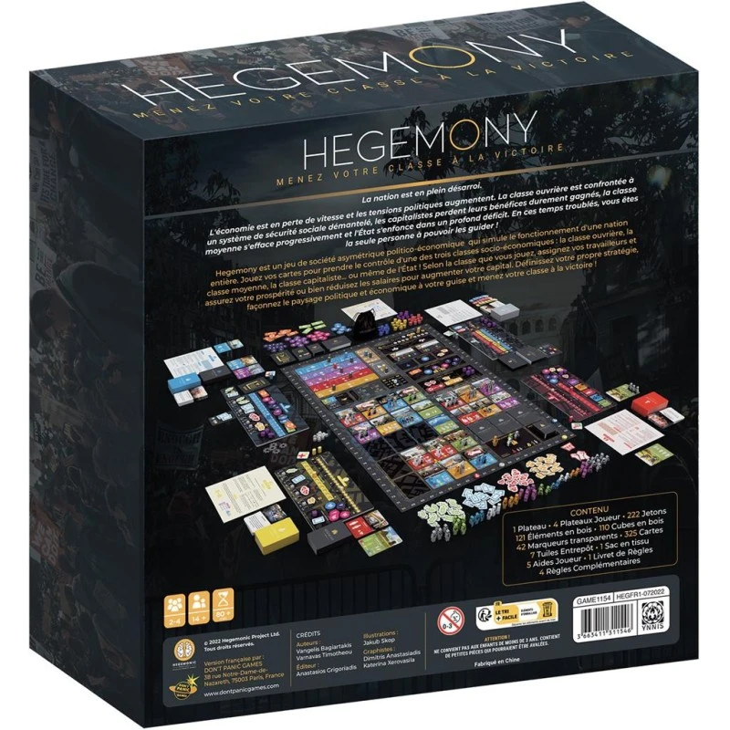 Hegemony est un jeu de plateau et de cartes asymétrique dans lequel les joueurs incarnent un groupe spécifique : La Classe Ouvrière, la Classe Moyenne, la Classe Capitaliste et l’État. Chaque rôle a sa propre manière de jouer. Les joueurs doivent essayer de se tenir à leur propre agenda politique.