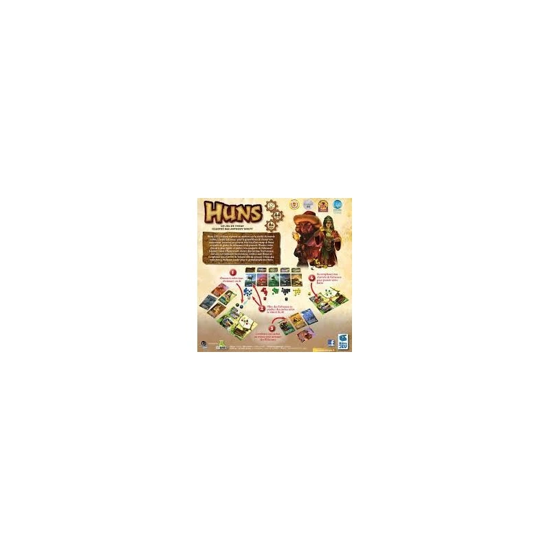 Huns, jeu de société de draft, de dés, de gestion et de tactique. Vous voulez devenir le nouveau Khan, et gouverner les Huns ? Alors lancez des razzias, résistez aux fléaux, recrutez des mercenaires, gagnez des équipements, et découvrez de fabuleux trésors ! Cela vous aidera à amasser le plus imposant des magots, et vous sacrera Roi des Huns !