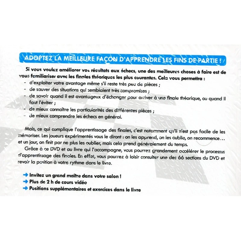 Un fascicule accompagné d’un DVD pour vous initier au b-a ba des finales – pour être précis, une présentation des finales élémentaires à connaître suivies d’un chapitre exposant 20 principes de base destinés à guider votre jeu. Rien de révolutionnaire bien sûr, mais le texte est clair et parfaitement didactique et la présence du DVD d’accompagnement séduira les (nombreux) joueurs débutants à qui tout livre de finales tombe des mains au bout de huit pages.