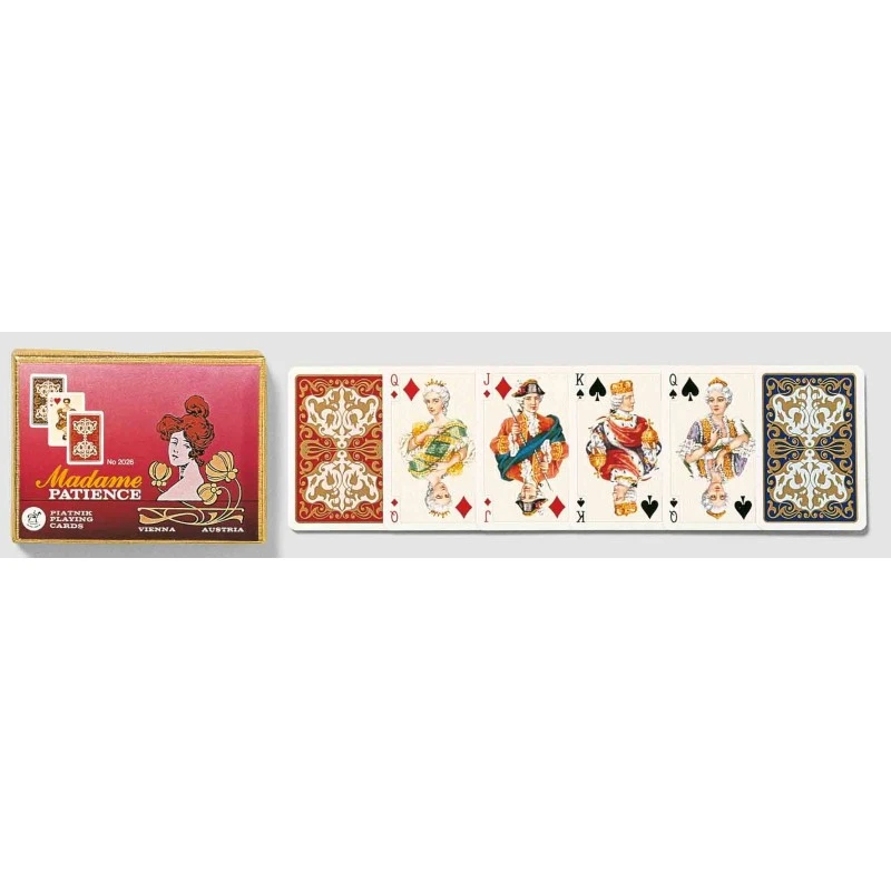 Jeux de Cartes Patience Madame. Coffret de 2 jeux de cartes de patience. Ces cartes de petit format ( 6,5cm x 4,2 cm) sont idéales pour faire des réussites. Fondée en 1824 à Vienne, Piatnik fabrique toujours ses jeux en Autriche, dans le respect de normes strictes de qualité et de l’environnement. Sa collection est la plus large du monde.