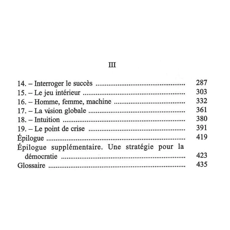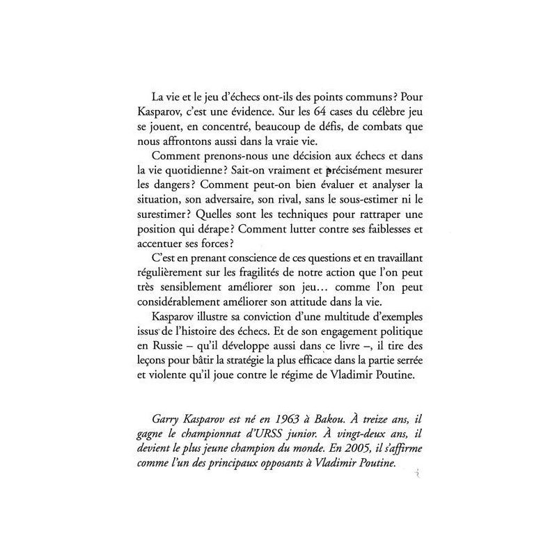 Tout de même, quel cabot, ce Kasparov : se faire arrêter juste pour assurer la promo de son livre Sérieusement, il faut préciser aux fans déchecs que ceci est un livre sur les échecs pour les gens qui ne jouent pas aux échecs puisque on ny trouve quun seul diagramme (celui de la position de départ) et naturellement aucune partie. On peut par contre samuser un moment au jeu des 77 erreurs quant à savoir lesquelles sont dues au cher Garry, lesquelles à la traduc et lesquelles à léditeur, on ne savancera pas.