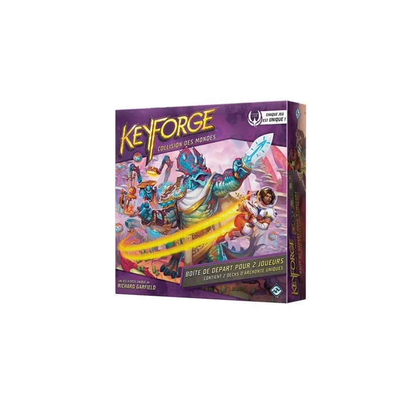 KeyForge – Collision des Mondes – Starter pour 2 Joueurs. Jeu de cartes stratégique de combinaisons de type deck-building. Dans ce jeu singulier qu’est Keyforge et où aucun deck n’est identique, deux joueurs s’affrontent afin de forger des clés qui leur permettront d’ouvrir les grands caveaux cachés du Creuset. Avec un nombre incalculable de combinaisons de créatures, d’artéfacts et d’actions, chaque deck est véritablement unique, rendant chaque affrontement complètement différent. Et pour couronner le tout, deux nouvelles maisons entrent dans la bataille !