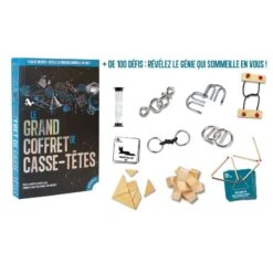 Contenu:4 casse-têtes en métal, 2 casse-têtes en bois, 1 tangram en bois avec 50 cartes challenges, 30 allumettes avec 50 cartes challenges, 1 sablier et les solutions en cas de panne sèche 😉