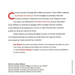 Les ouvertures d’échecs pour les enfants. Peut-être une fausse bonne idée : d’abord, la présentation assez austère du livre ne le destine clairement pas aux enfants à proprement parler ; et deuxièmement, le format choisi – 50 « grandes » ouvertures présentées succinctement – laisse un peu le lecteur sur sa faim : en deux pages et six diagrammes, on n’apprend pas grand-chose sur la Najdorf ou la Semi-Slave… Une intro apéritive, tout au plus.