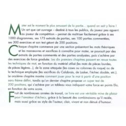 Près de 600 pages grand format, 115 parties complètes commentées et 173 fins de parties (mais pas « finales », vous l’aurez compris) pour illustrer les différents thèmes présentés, et 519 exercices pour mettre en application ce qu’on aura appris. Copieux, clair et plaisant (on connaît l’auteur), un livre indispensable à tous les apprentis champions…