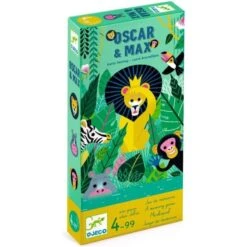 Oscar & Max est un jeu de mémoire pour jouer en famille à partie de 4 ans. Oscar, le roi de la jungle, doit rassembler tous ses sujets. Mais les zèbres, les hippopotames et les perroquets ne répondent pas à son appel… Aidez Oscar à retrouver un maximum d’animaux, mais attention à Max, le singe malicieux, qui sème la pagaille.