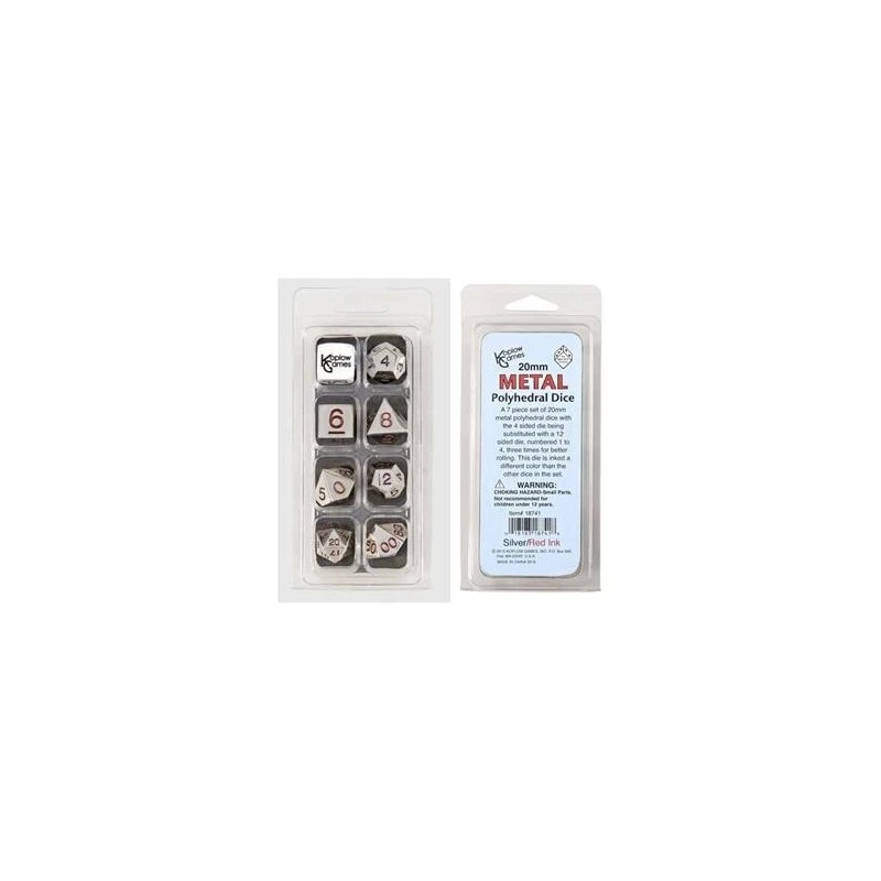 Pack 7 dés metal polyhedral 20mm pour jeux de plateau et de rôle. 7 dés en métal argenté avec les nombres en rouge sauf le dé à 12 côtés.