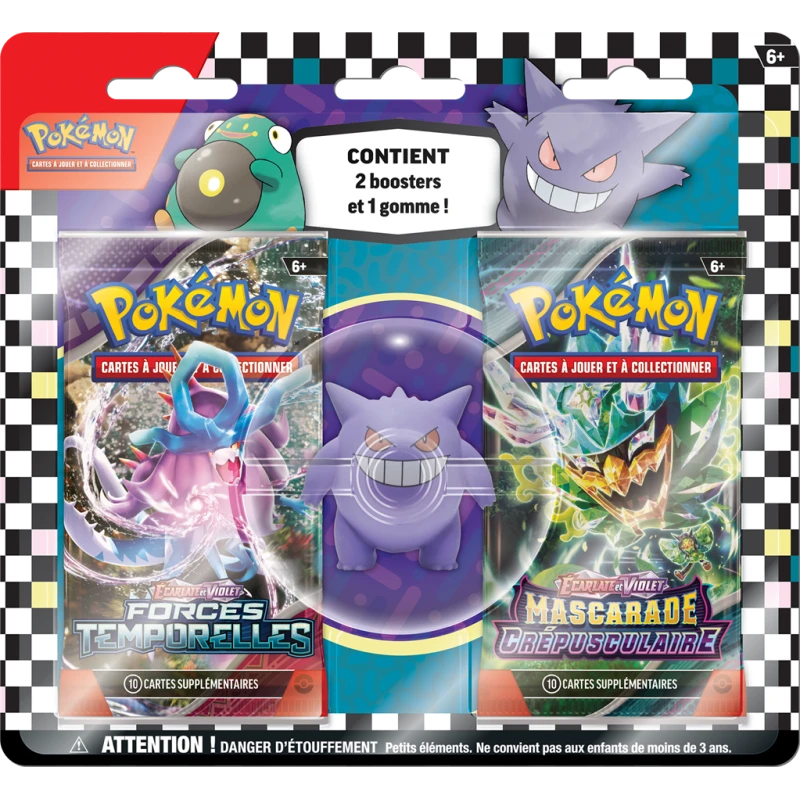 Pack contenant deux boosters pour le Jeu de Cartes à Collectionner Pokémon et une gomme d’Ectoplasma ou d’Ampibidou.