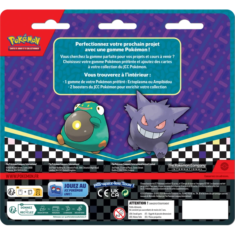 Pokémon DuoPack : Blister Gomme Rentrée des Classes. Pack contenant deux boosters pour le Jeu de Cartes à Collectionner Pokémon et une gomme d’Ectoplasma ou d’Ampibidou.