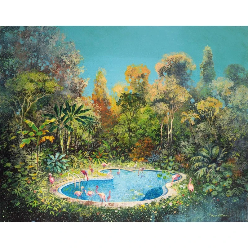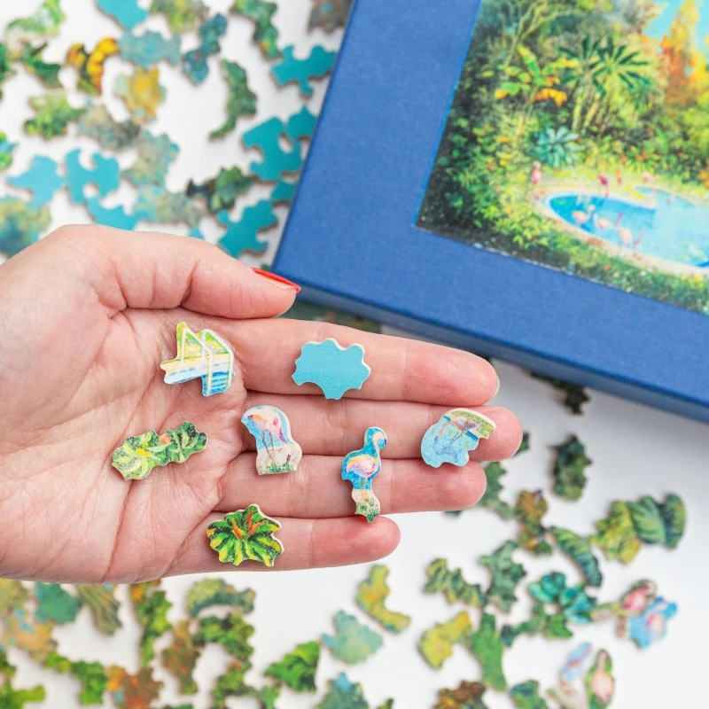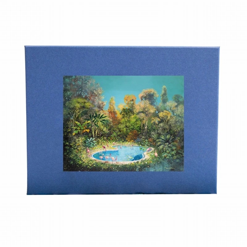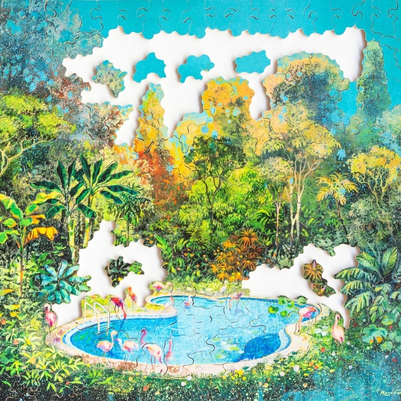 Eric Roux-Fontaine est un artiste français qui vit et travaille à Paris. Il développe un style singulier mêlant abstraction et figuration. S’inspirant du cinéma et de ses voyages, il crée des scènes saisissantes riches en détails. Au cœur d’une végétation luxuriante, une piscine sert d’oasis à un groupe de flamants roses. L’artiste qui joue brillamment avec les contrastes et les textures, nous offre une expérience visuelle passionnante à reconstituer en puzzle !