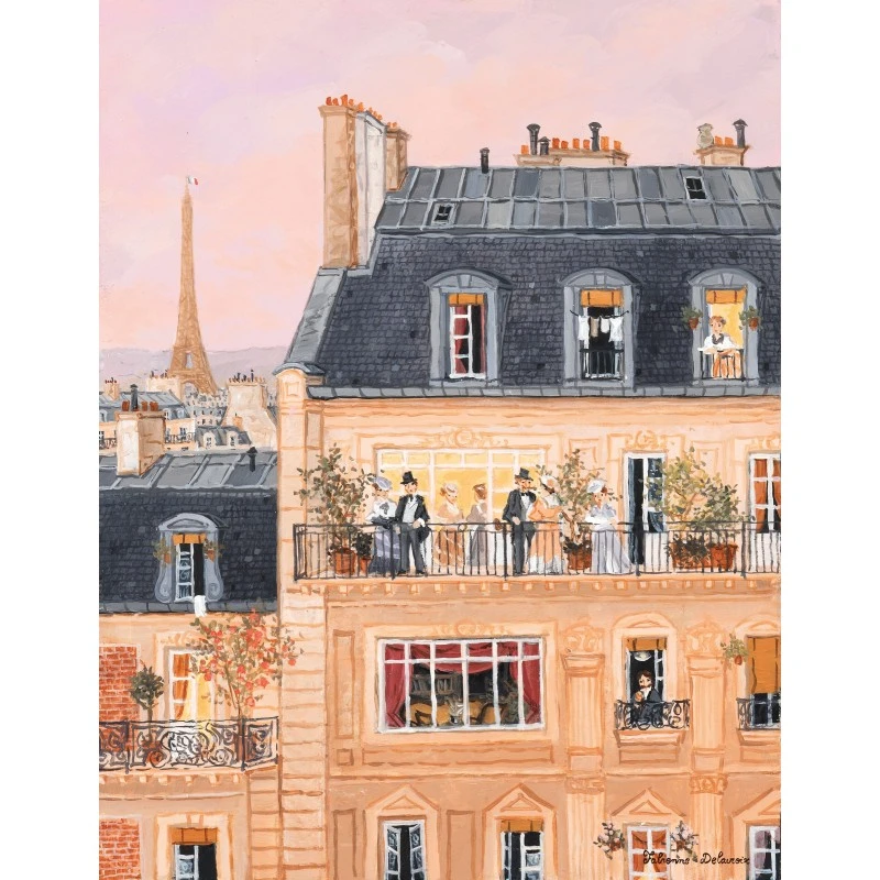 Fabienne Delacroix est une peintre figurative française qui vit et travaille à Paris. Elle s’inspire du XIXe siècle pour créer des scènes au style naïf, comme autant d’histoires qu’elle nous raconte à travers de nombreux détails. Dans cette toile nommée Chez Madame, l’artiste représente la façade d’un immeuble Haussmannien laissant entrevoir la vie des habitants.