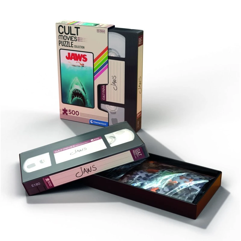 Puzzle 500 pièces de l’affiche du film Les Dents de la Mer (Cult Movies Puzzle Collection de Clementoni). Un puzzle pour les nostalgiques, présenté dans une boite cartonnée en forme de cassette vidée VHS.