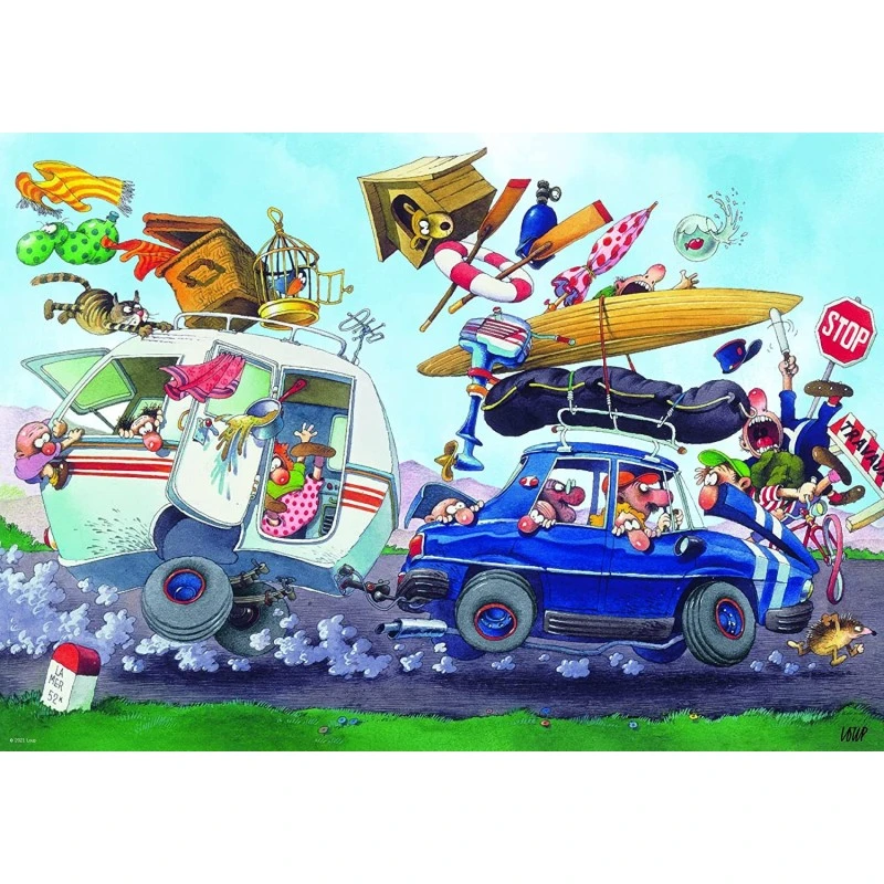 Puzzle humoristique 500 pièces Off on Holiday de l’illustrateur Loup. Accrochez-vous bien car le départ en vacances semble mouvementé !