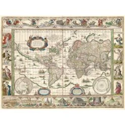 Nommée Nova totius Terrarum Orbis geographica ac hydrographica tabula ou « Nouvelle représentation géographique et hydrographique de toutes les terres du monde », cette carte ancienne en latin est l’oeuvre du cartographe néerlandais Willem Blaeu. Celle-ci reflète les connaissances géographiques et scientifiques du début du XVIIe siècle. Elle est entourée d’illustrations détaillées : sept figures allégoriques représentent les sept « planètes » connues à l’époque, les quatre éléments, les quatre saisons et sept merveilles du monde antique.