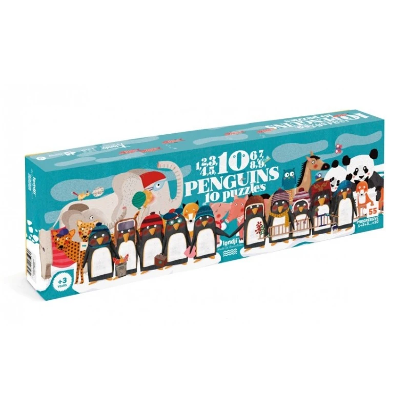 Puzzle 55 pièces Panorama – 10 Penguins. Puzzle pour enfants. Illustration de Txell Darne. Boîte en carton rigide.