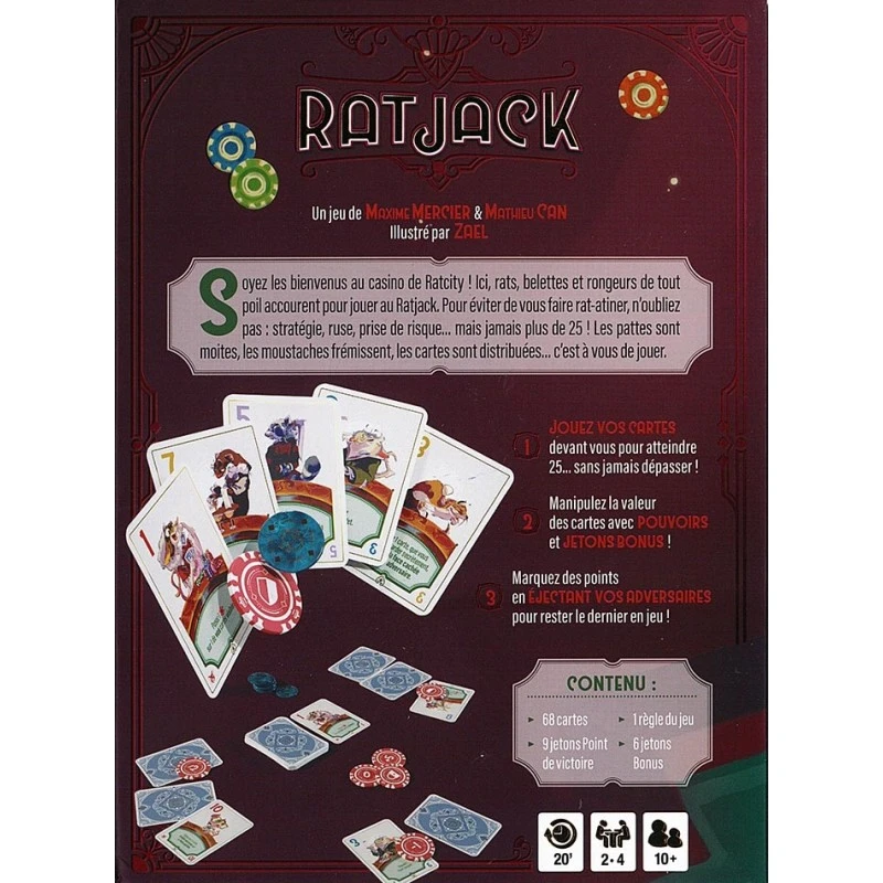 Ici, rats, belettes et rongeurs de tout poil accourent pour jouer au Ratjack. Pour éviter de vous faire rat-atiner, n’oubliez pas : stratégie, ruse, prise de risque… mais jamais plus de 25 ! Les pattes sont moites, les moustaches frémissent, les cartes sont distribuées… C’est à vous de jouer. Dans Ratjack, chaque paquet est composé de 12 cartes de 1 à 12, chacune ayant une capacité spéciale.