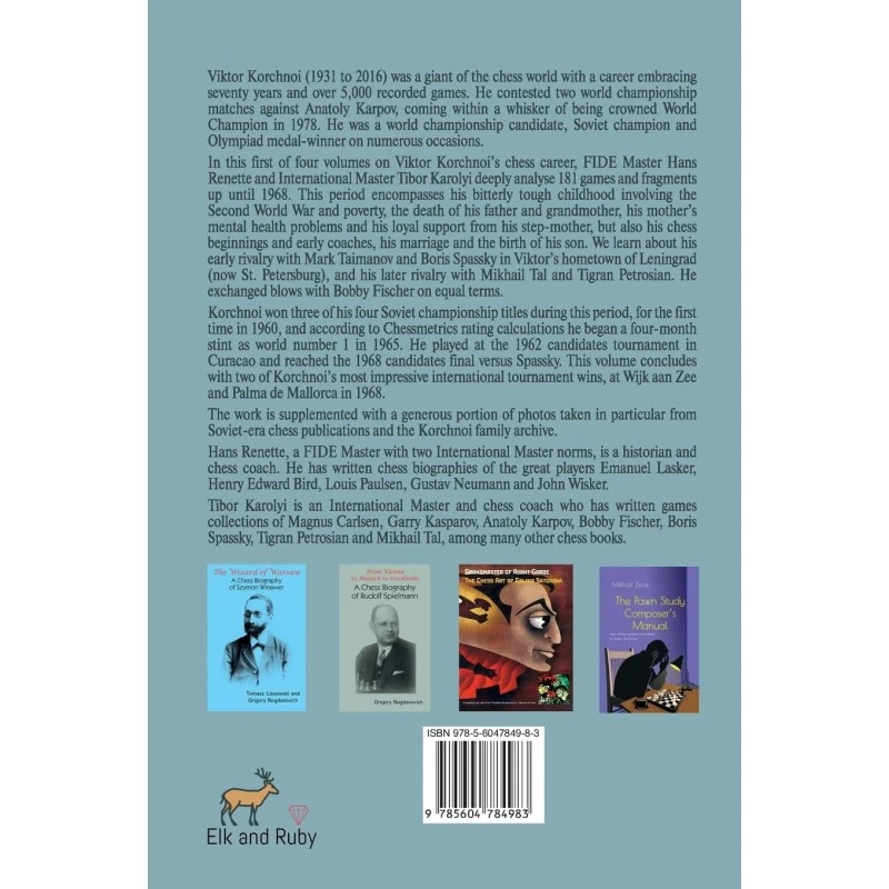 In this first of four volumes on Viktor Korchnoi’s chess career, FIDE Master Hans Renette and International Master Tibor Karolyi deeply analyse 181 games and fragments up until 1968. This period encompasses his bitterly tough childhood involving the Second World War and poverty, the death of his father and grandmother, his mother’s mental health problems and his loyal support from his step-mother, but also his chess beginnings and early coaches, his marriage and the birth of his son. We learn about his early rivalry with Mark Taimanov and Boris Spassky in Viktor’s hometown of Leningrad (now St. Petersburg), and his later rivalry with Mikhail Tal and Tigran Petrosian. He exchanged blows with Bobby Fischer on equal terms.