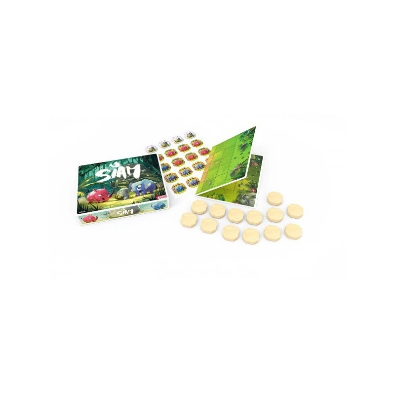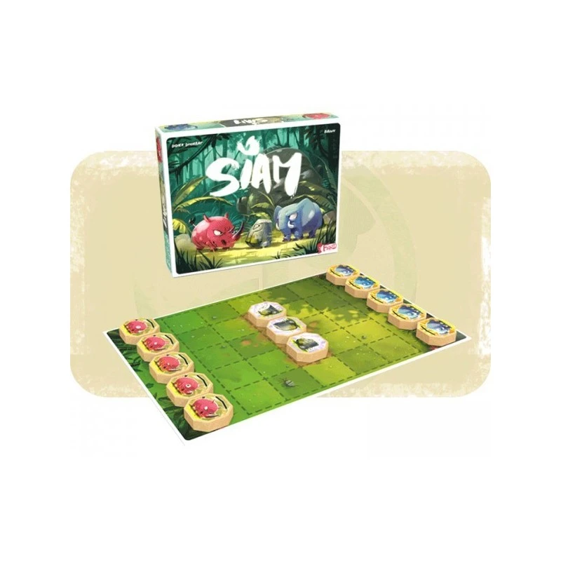 Siam. Jeu de stratégie. La trompe de l’éléphant est-elle plus forte que la corne du rhinocéros ? La question fait toujours furieusement débat dans le royaume de SIAM, les deux espèces puissantes et orgueilleuses se défiant sans discontinuer autour de trois rochers pour prouver leur domination…