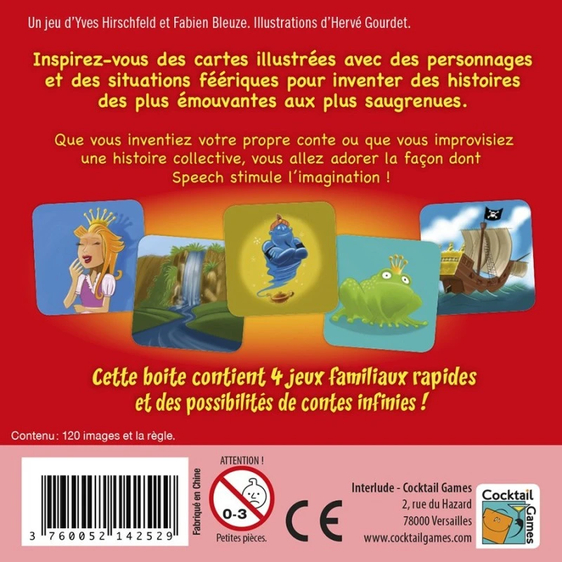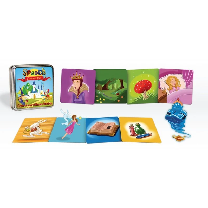 Speech « Contes de fées » propose 120 illustrations sur la thématique fantasy et la littérature des contes merveilleux pour créer des histoires délirantes et insolites. Avec 4 modes de jeu différents, l’imagination des petits et des grands sera à la fête. Un excellent jeu de langage pour improviser des histoires en classe ou en famille.
