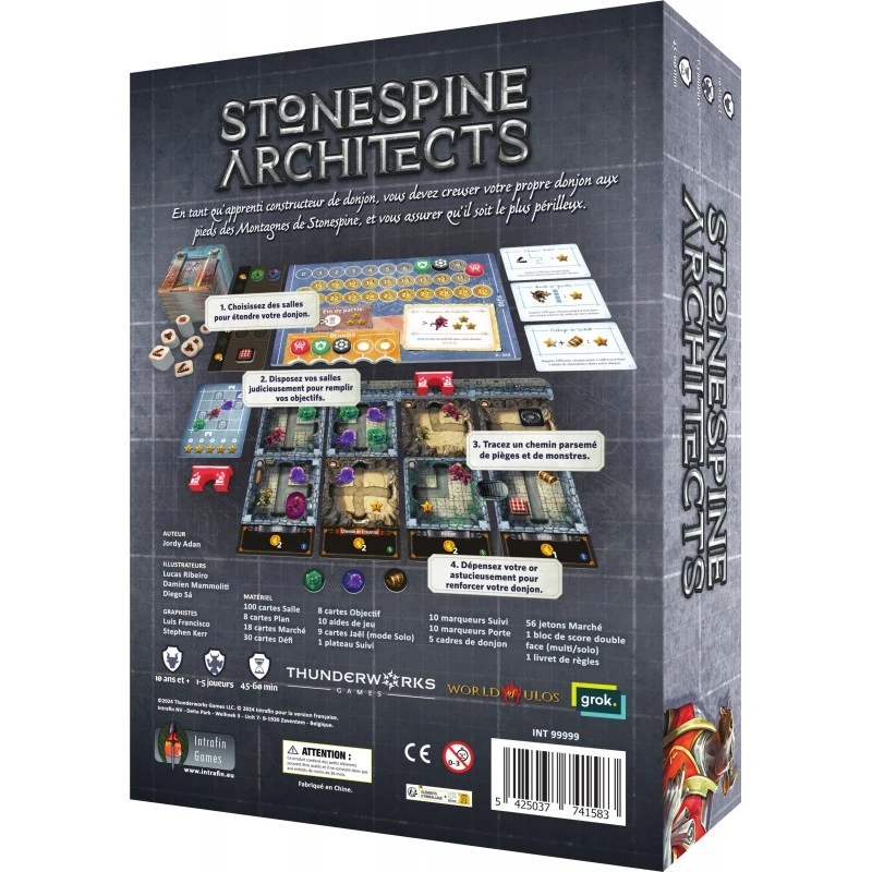 Stonespine Architects est un jeu de drafting de cartes dans lequel 1 à 5 joueurs s’affrontent pour construire le labyrinthe le plus dangereux. Les joueurs piochent et jouent simultanément des cartes pour agrandir leurs donjons, une chambre à la fois. Suivez un plan unique et une variété de défis à relever pour marquer des points. Choisissez entre tracer un chemin dans vos passages souterrains, placer des éléments clés dans vos salles ou chercher des trésors supplémentaires. Dépensez de l’or entre les tours pour personnaliser votre labyrinthe avec des monstres, des pièges, des trésors et des passages secrets. Au bout de quatre ans, le joueur qui aura le donjon le plus périlleux gagnera le titre de maître architecte !