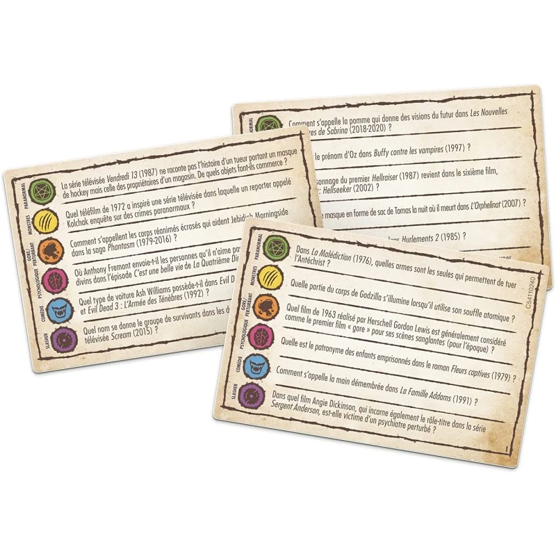 6 CATÉGORIES DE QUESTIONS : PARANORMAL, MONSTRES, GORE/PERTURBANT, PSYCHOLOGIQUE, COMÉDIE, SLASHER