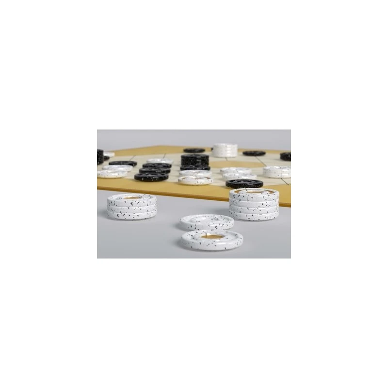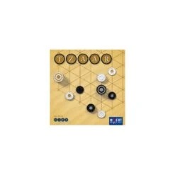 Tzaar. Jeu de tactique moderne qui se joue à deux. Protéger votre Trio ! Quand c’est au tour d’un joueur, il doit choisir : battre les pions adverse ou plutôt renforcer sa propre position composé de 3 sortes de pièces. Tel est le dilemme et la décision n’est pas facile à prendre.